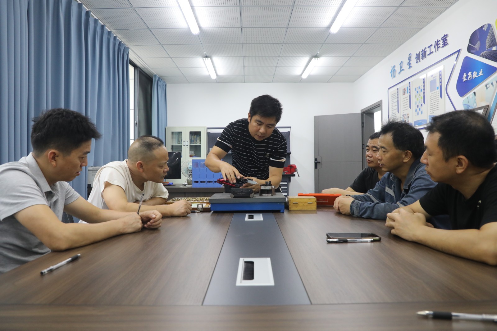 培训中,杨卫星采用实物对照图纸的方式,系统讲解燕尾槽加工前处理、凸件与凹件制作流程、工件质量检查方法与技巧等内容,着重强调配合要求、形位公差、表面粗糙度等关键技术要点。测量环节,他演示与指导结合,详细讲解正旋规量具测量原理、量块高度计算方法及注意事项,手把手传授精密量具测量技巧,确保学员掌握操作要领。此外,他结合外出参赛和“五小”技术创新经验,剖析钳工技术发展变化,分享新思想、好经验,积极弘扬劳模精神、劳动精神和工匠精神。参培钳工收获满满,对技术革新充满信心。